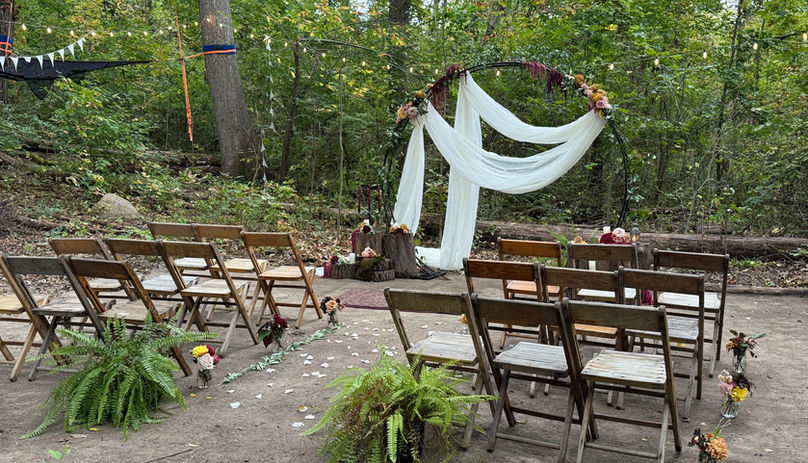 Tucked beneath the trees at the edge of our forest, this secluded ceremony space feels like it’s been whispered into existence by the woods themselves. Dappled sunlight filters through the canopy, dancing across mossy stones and native greenery that bloom as if in celebration. The space comfortably welcomes up to 30 guests, offering an intimate and serene setting where vows can echo like poetry through the stillness.